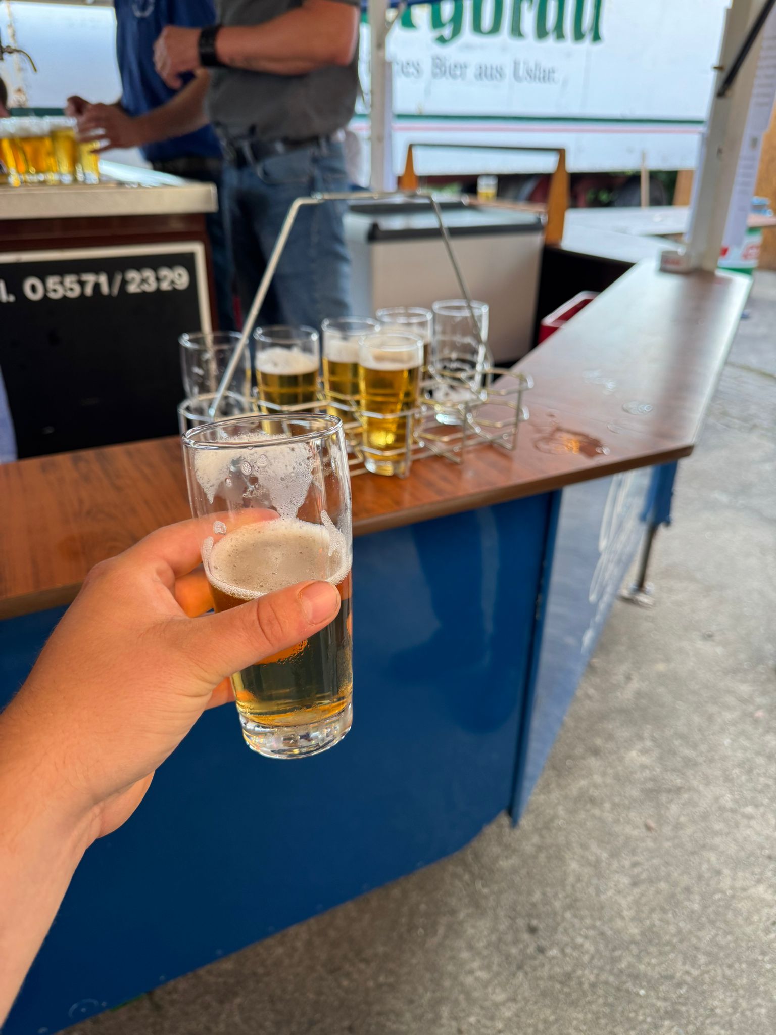 13. Juni 2025 auf der neuen B 241 fahren wir zum Oldtimer Treffen nach Moringen. Sonne satt und völlig Unterhopft kamen wir im Domänenhof an. Nach Aufstellen unserer Oldies wurden wir im Partyzelt mit o3er Gläsern im 11ver Träger mit dem köstlichen Einbecker Brauherrenpils versorgt. Ruckzuck war der leer und im benachbarten Bierpils wurde Nachschub geordert, sodaß die Unterhopfung geringfühgig verbessert wurde. Pommes und Bratwurst wurden verzehrt und danach klopfte die UH wieder an. Schnell wurde die flotte Bedienung im Bierzelt gebeten uns ein Gegenmittel in Form eines 11ver Trägers zu servieren. Ob es das einzige war? Man weiß es nicht. Was wir aber wissen ist, dass wir Sonntag Nachmittag unsere Autos wieder zurückgeholt haben.
